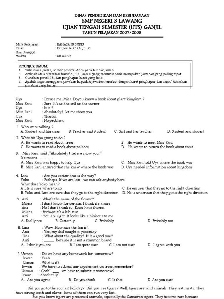 Latihan soal pts uts bahasa inggris kelas 9 smp semester 1 materi soal ulangan bahasa inggris tingkat smp untuk un. Soal ini terdiri dari soal pilihan ganda/ pg dan isian untuk berlatih putra dan putrinya dalam rangka mempersiapkan untuk menghadapi ph atau uh sehingga nanti pada saatnya ujian dari guru pembimbingnya siswa/i sudah siap. ulangan mid semester kelas vii dan vii. A 9 smp semester ganjil luk lks lembar uji kompetensi pendidikan. Kumpulan soal latihan uts pts kelas 3 sd mi semester 1 2. Demikian tadi contoh soal ulangan mid semester 1 mata pelajaran pjok yang bisa kami berikan. Soal pkn kelas 9 semester 1 : Administrasi silabus rpp kkm prota promes sd. Silahkan di copy dan pelajari. Soal bahasa inggris kelas 6 sd semester 2 kunci jawaban bahasa inggris memang tidak masuk ke dalam mata pelajaran ujian nasional un di jenjang sekolah dasar. Soal uh ke 1 pai kls 7 smt 1 2016; Soal uts / ulangan tengah semester 2 / genap kelas 9 mapel ipa. Tolong bantu jawab soal pai kelas 7 bab 5 hal 72 73 brainly co id.